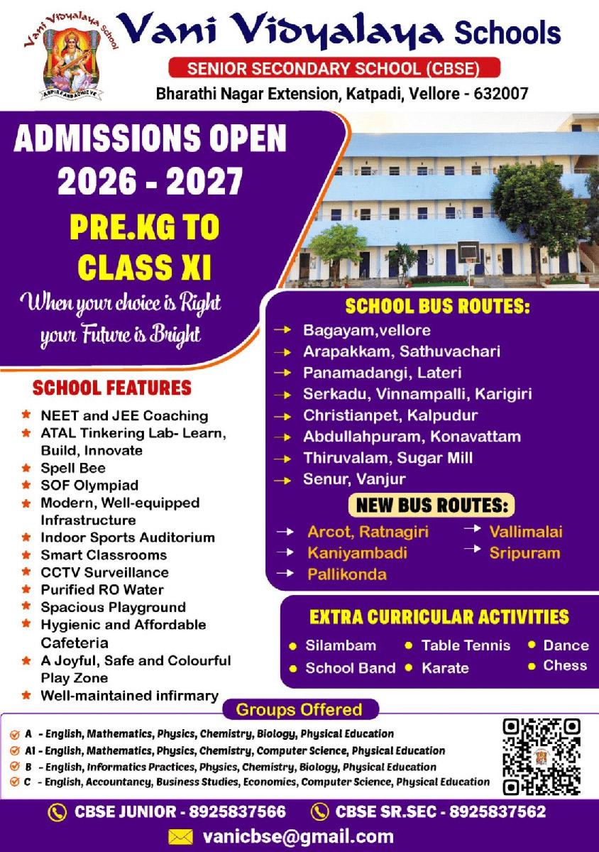 In 1972, Vani Vidyalaya School, Vellore was founded by Mr. S. Soundararajan to provide quality education by combining the traditions of Indian education with modern educational techniques.