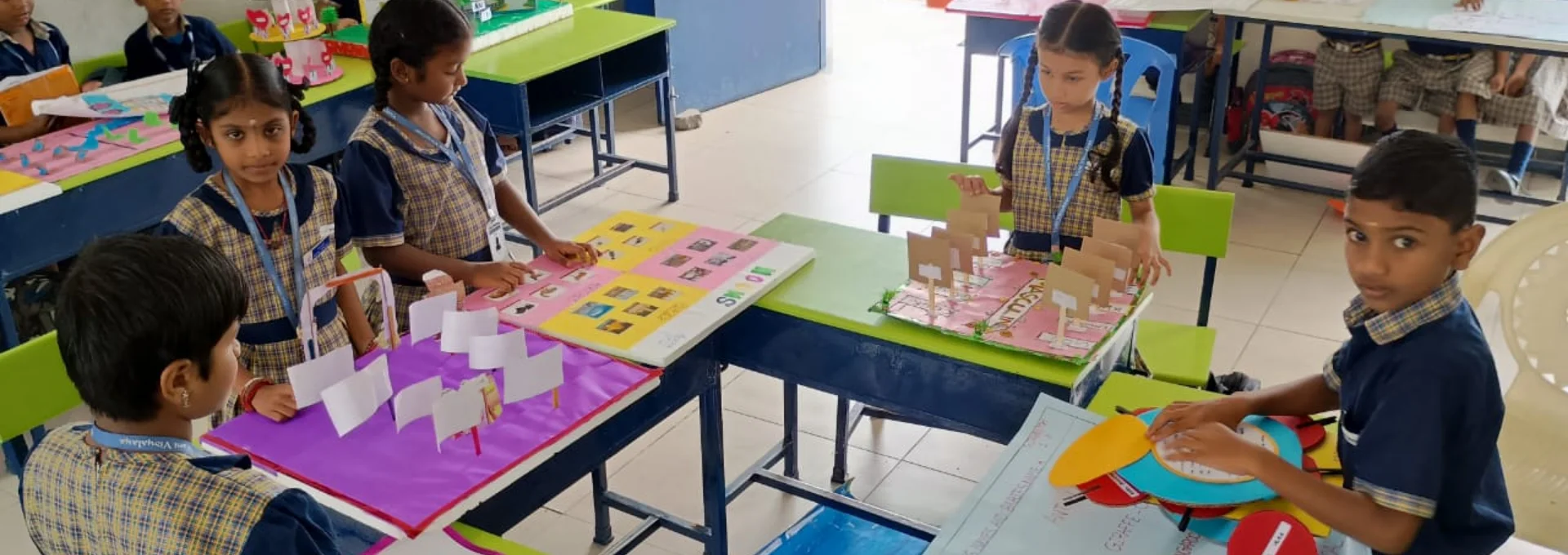 The school follows a three Language Policy (LANGUAGE I- ENGLISH, LANGUAGE –II TAMIL, LANGUAGE–III HINDI) to inculcate the habit of acquiring languages. Role play, Interviews, Projects, Field trips, Seminars and Presentation are some of the tools used for assessing the student’s progress.